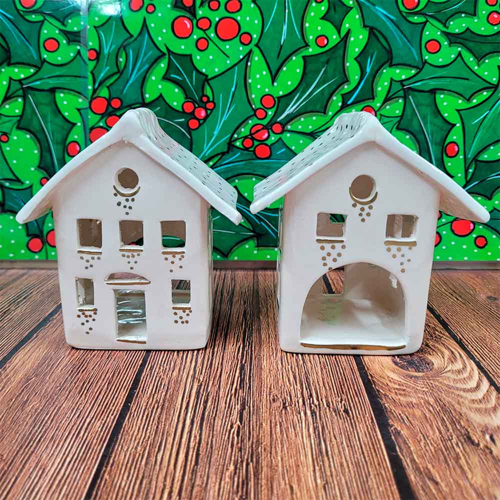 Con un piccolo lume all’interno, i nostri portacandele si animeranno di luce… che fuoriuscirร  dagli intagli a forma di stelle, nel caso dell’albero, e delle finestrelle, nel caso delle casette.