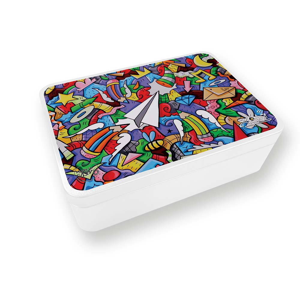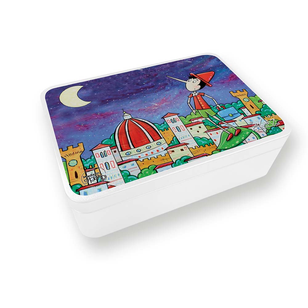 L’artista fiorentino SKIM ci ha gentilmente concesso l’uso di alcuni suoi disegni tra cui questi, dal titolo “Pinocchio e la luna di New York (bugia)” “Prova a prendermi nel Kaos”, con con cui abbiamo deciso di decorare questa scatola in latta.