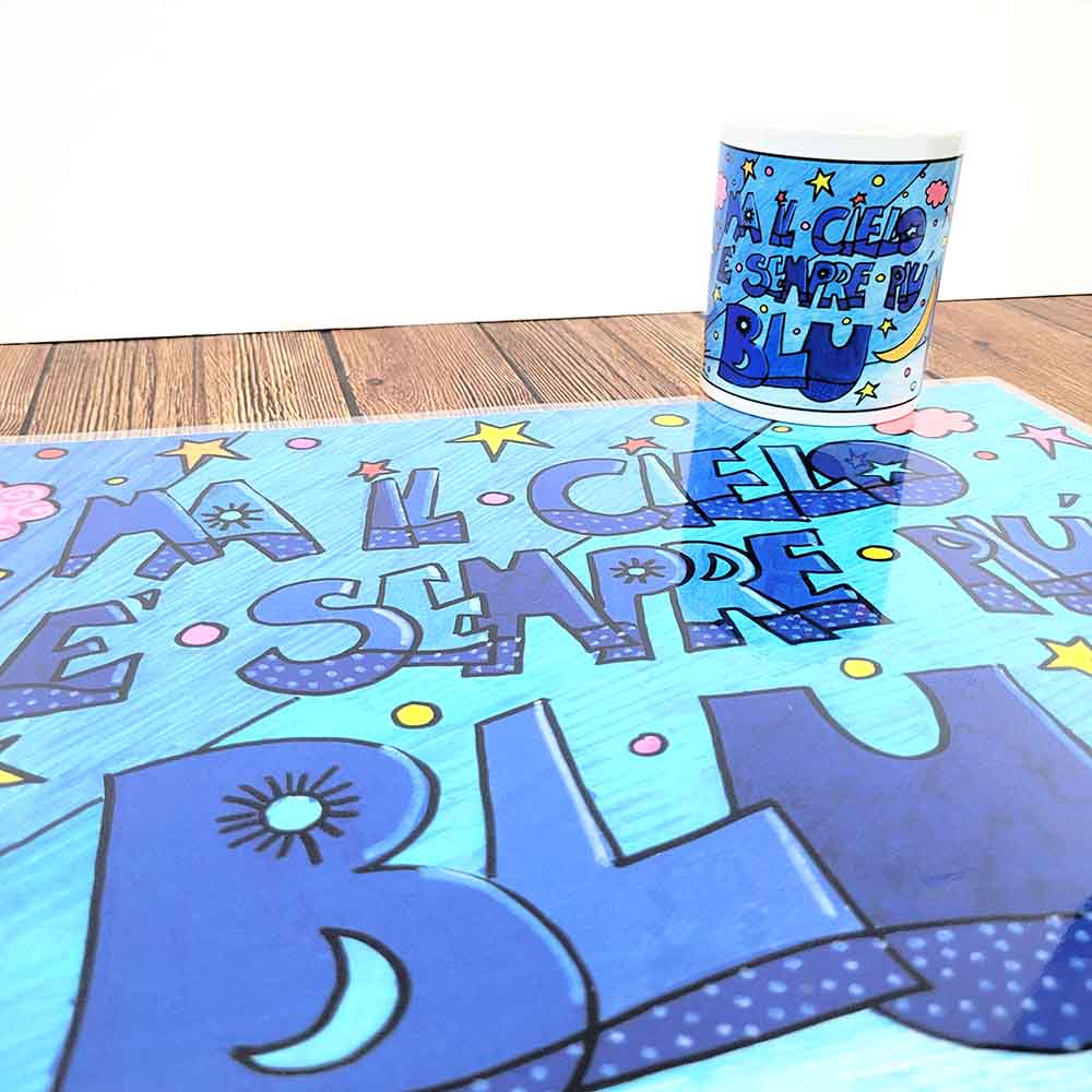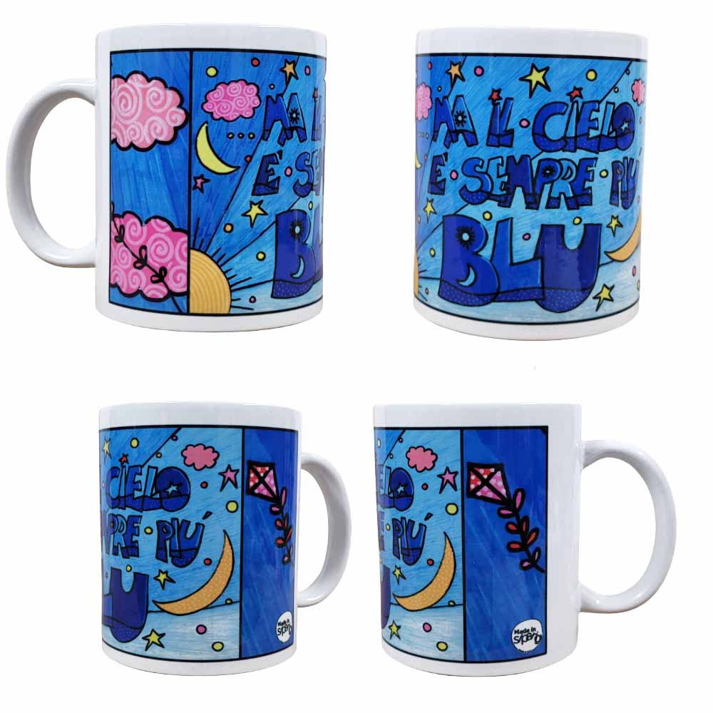 Tazza MUG in ceramica, stampata in sublimazione con il disegno “IL CIELO È SEMPRE PIÙ BLU”, una fantasia originale Made in Sipario.