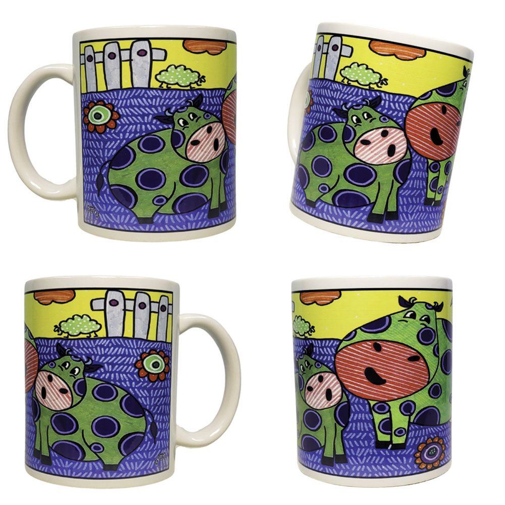 Tazza MUG in ceramica, stampata in sublimazione con il disegno “MUCCA”, una fantasia originale Made in Sipario.