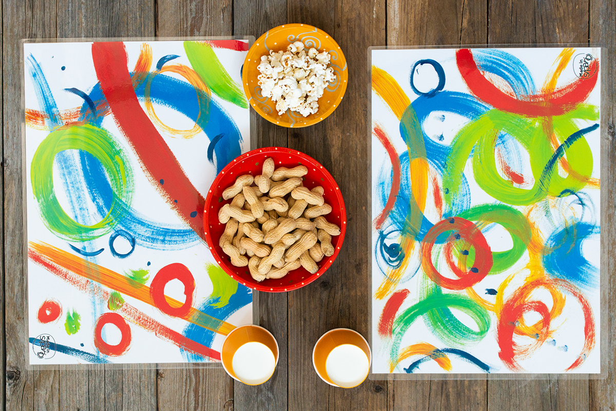 Tovaglietta in cartone, stampata a colori con fantasia originale Made in Sipario, plastificata in modo da renderla lavabile.