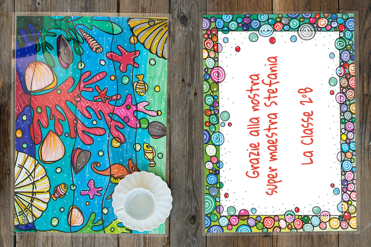 Un SET di Tovagliette che avranno sul Fronte la riproduzione stampata della tua dedica con la CORNICE da te scelta, mentre sul Retro uno dei disegni originali dei nostri Artisti Speciali, che potrai scegliere a tuo piacimento.