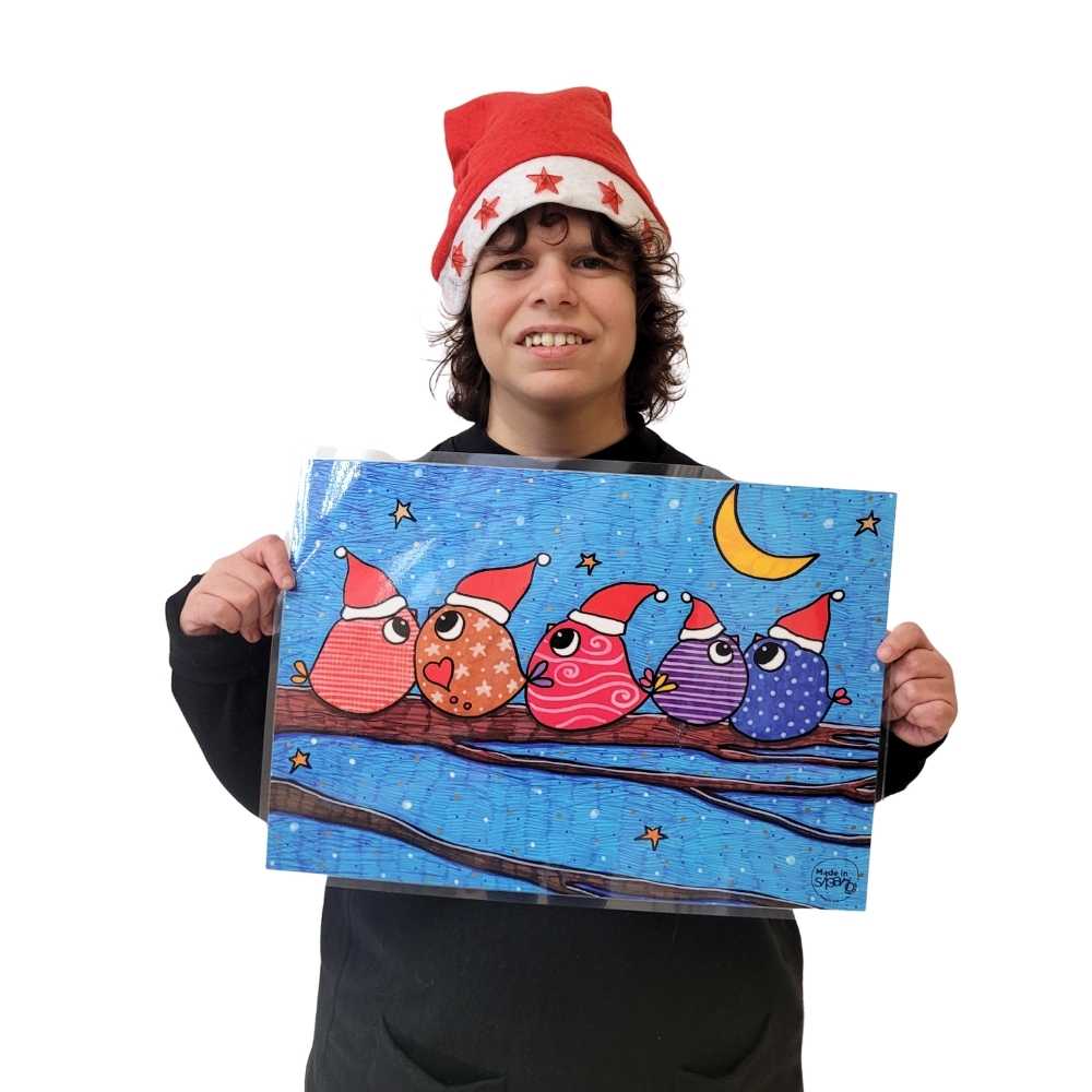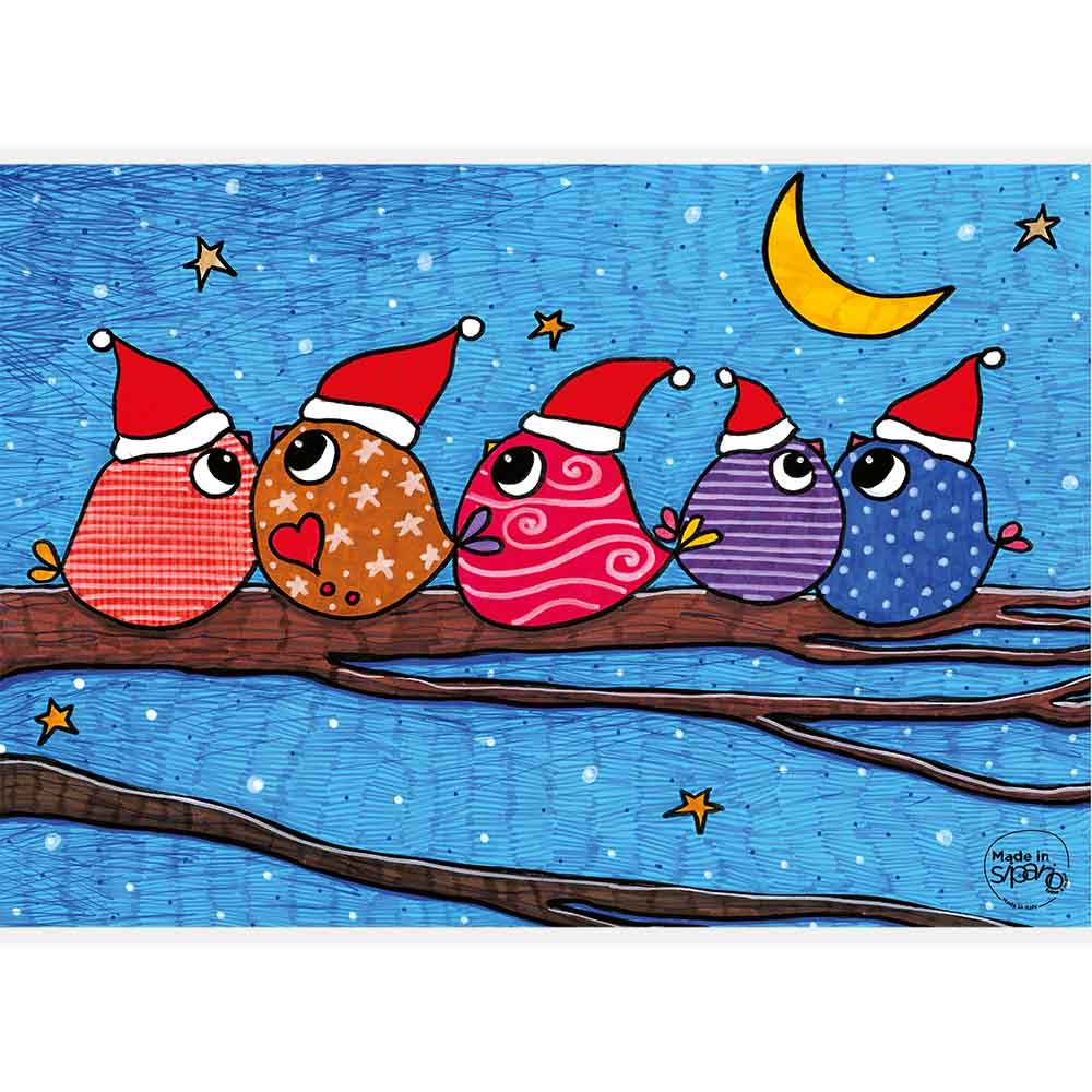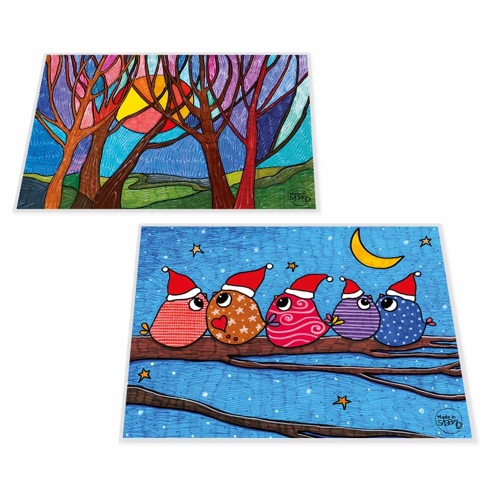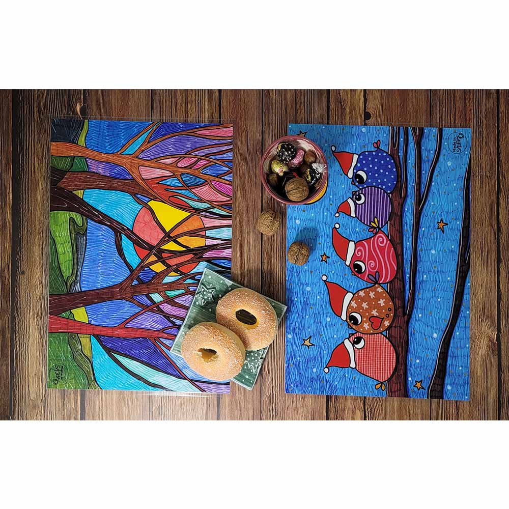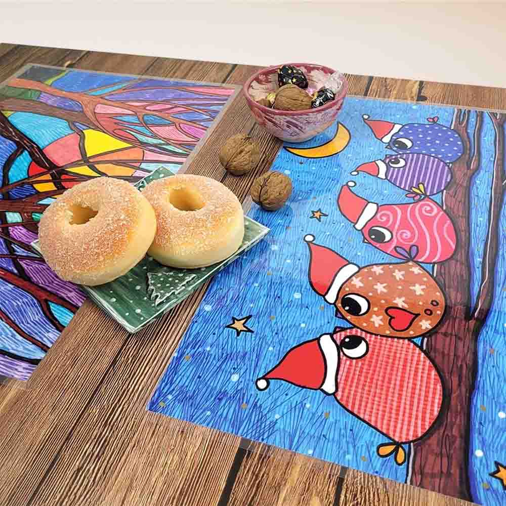 Tovaglietta natalizia raffigurante su un lato cinque simpatici uccellini che aspettano il natale sul ramo di un albero; dall’altro un bosco invernale nell’atmosfera magica di una luna piena.