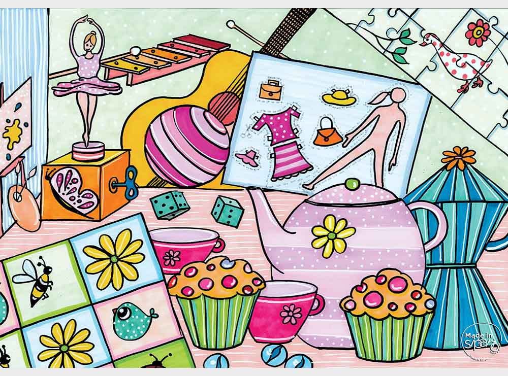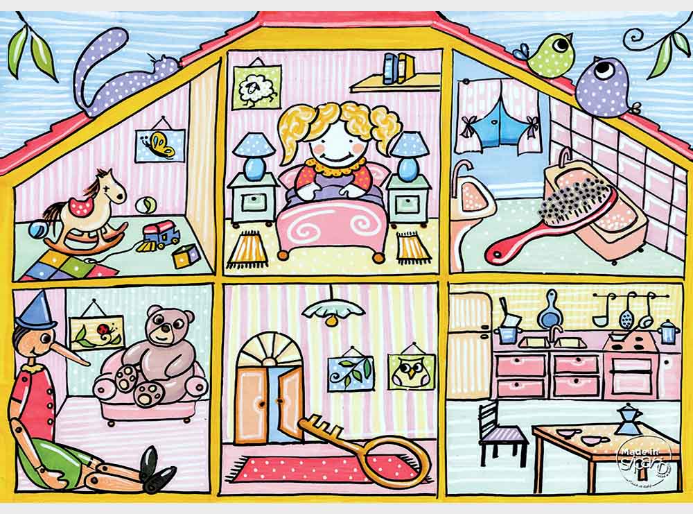 Il fronte vediamo l’interno di una dettagliata casa delle bambole mentre sul retro vediamo altri oggetti presenti nella cameretta di una bambina.