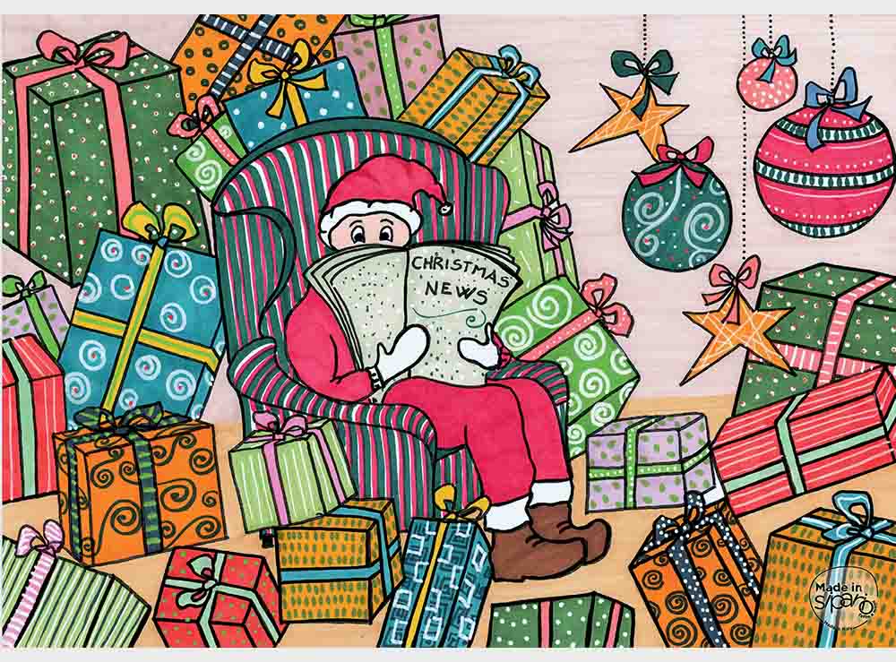 Tovaglietta natalizia raffigurante su un lato Babbo Natale che legge il giornale circondato dai pacchi regalo pronti da consegnare e dall’altro una simpatica renna fa capolino nel bosco.