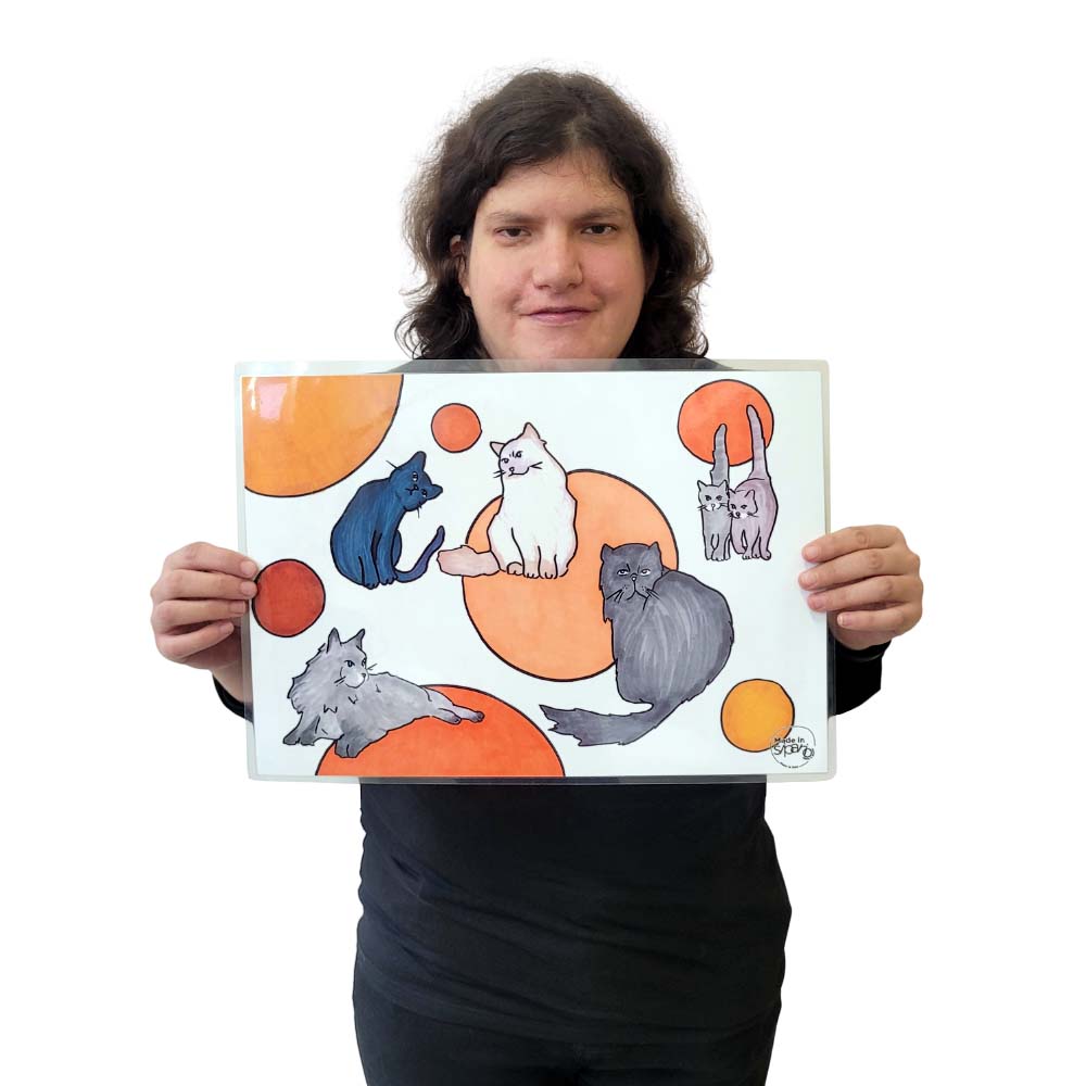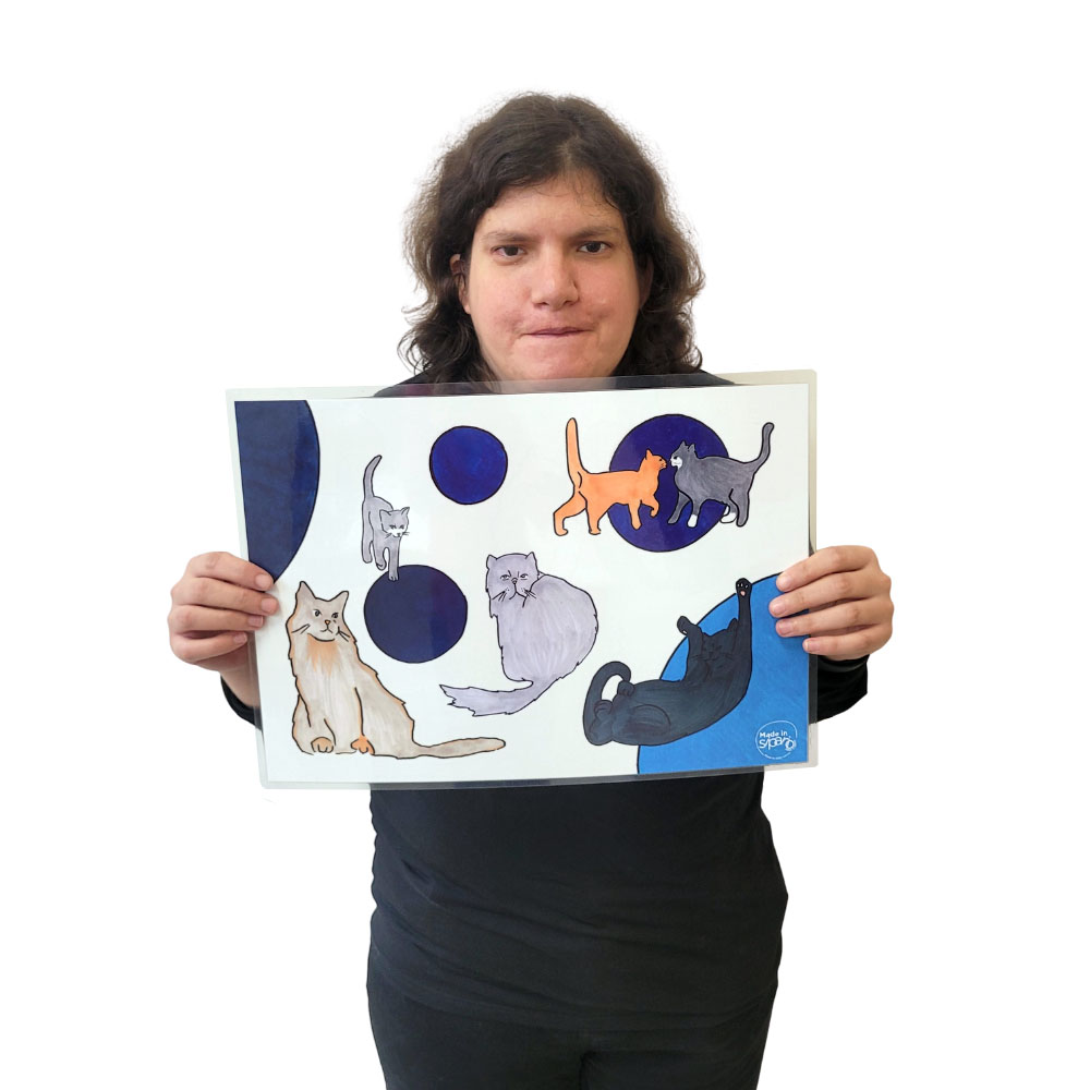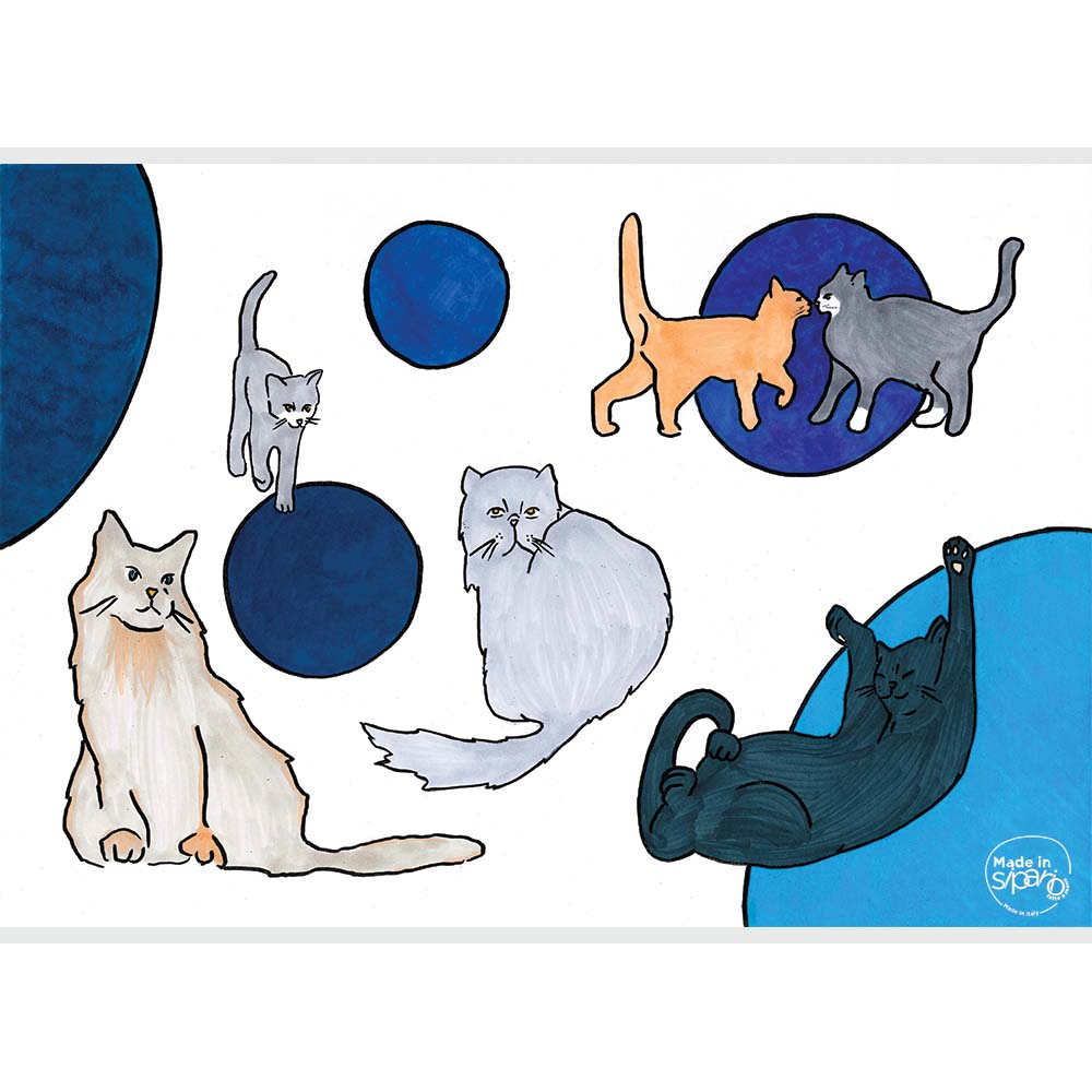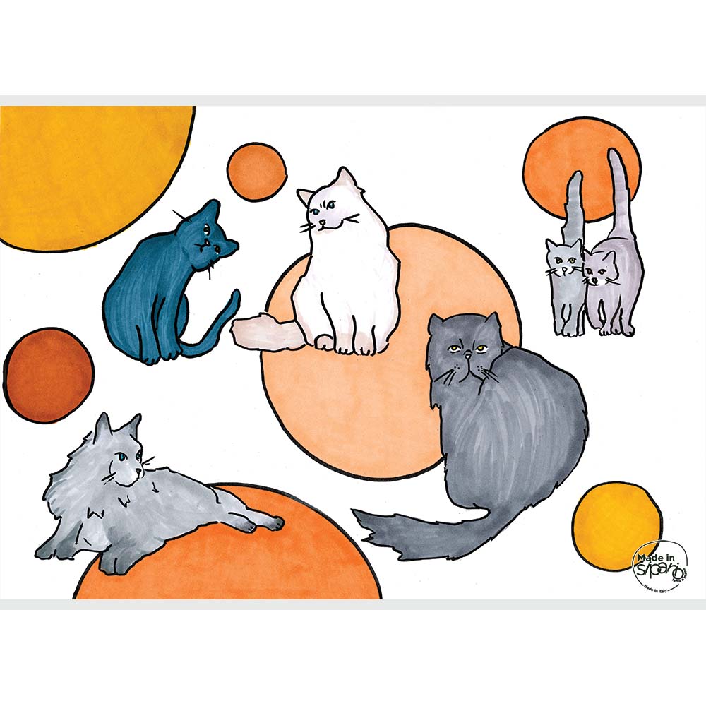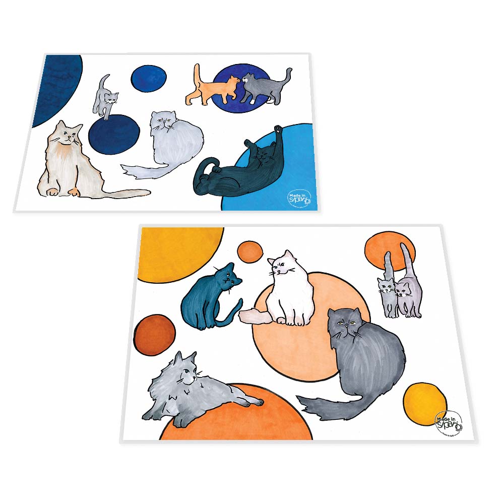 Questa tovaglietta appartiene alla serie “CANI e GATTI”, dedicata dagli Artisti Speciali alle varie razze dei loro amati amici. I due lati riportano disegni differenti e ritraggono vari gatti nelle loro buffe pose.. mentre si stiracchiano, mentre strusciano tra loro i musetti, mentre inarcano la schiene stupiti…