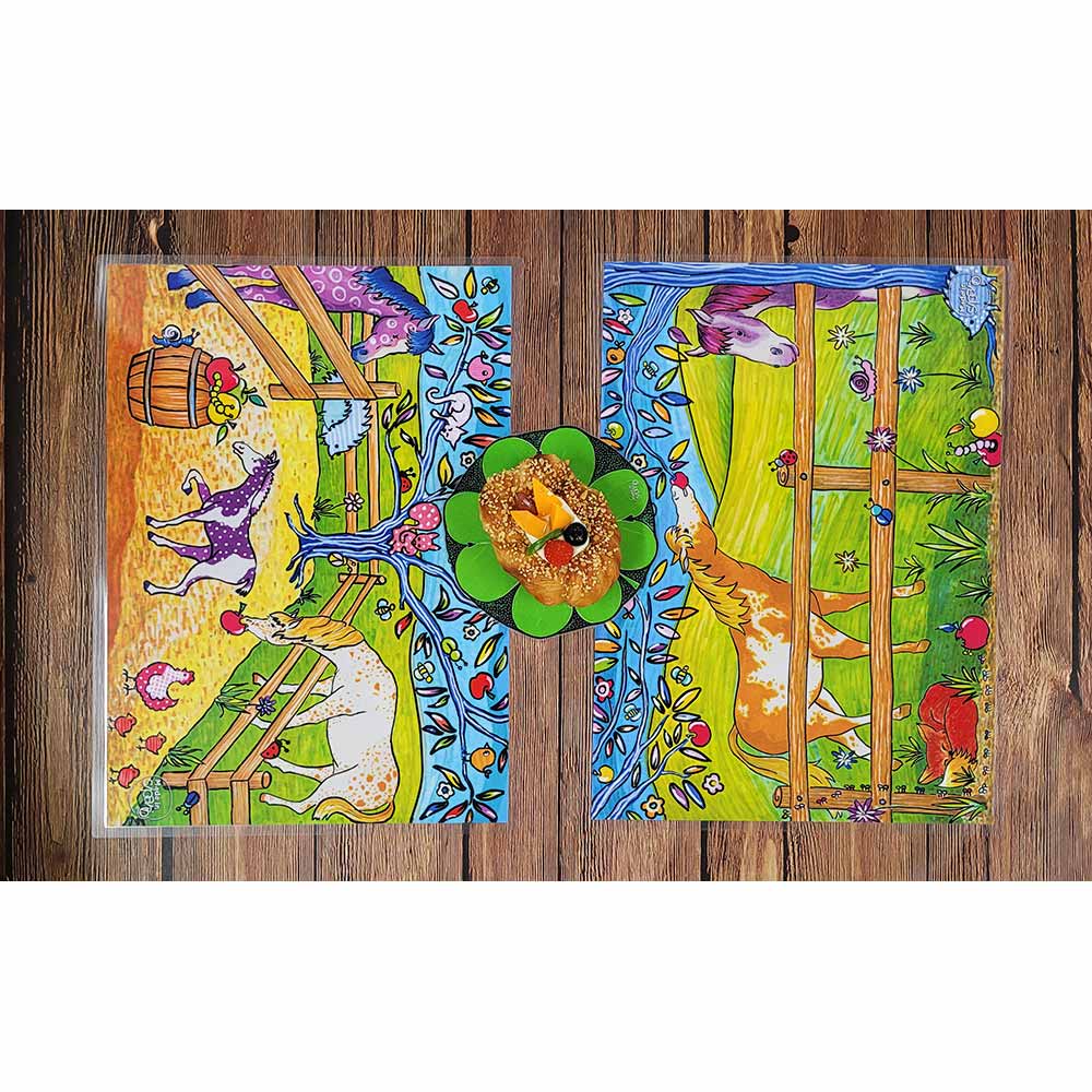 Tovaglietta in cartone, stampata a colori con fantasia originale Made in Sipario, plastificata in modo da renderla lavabile.