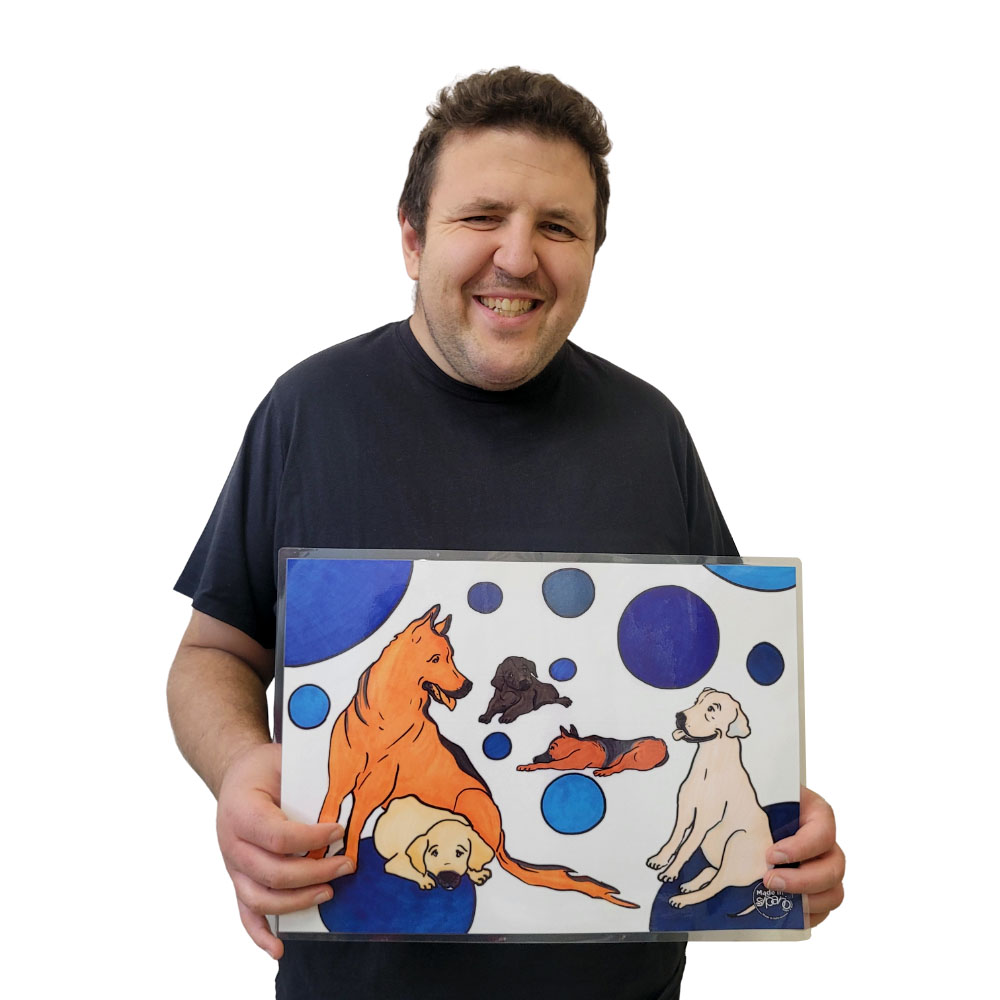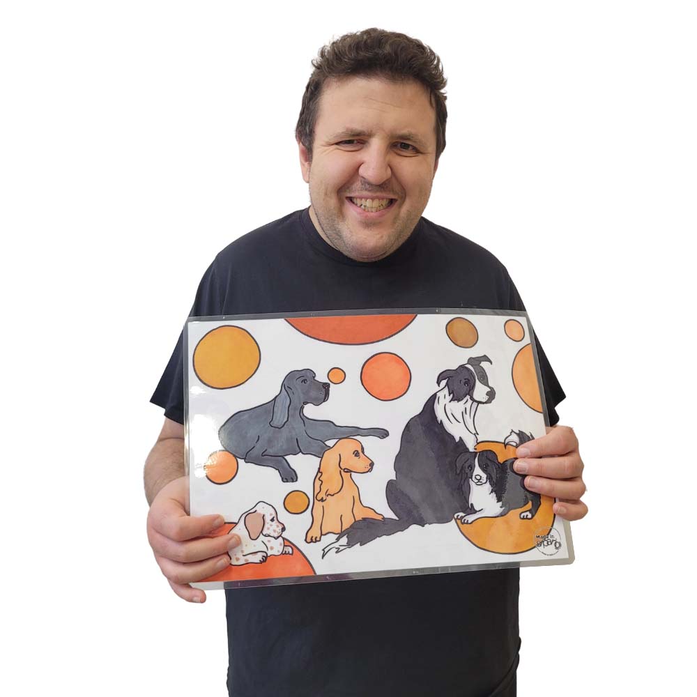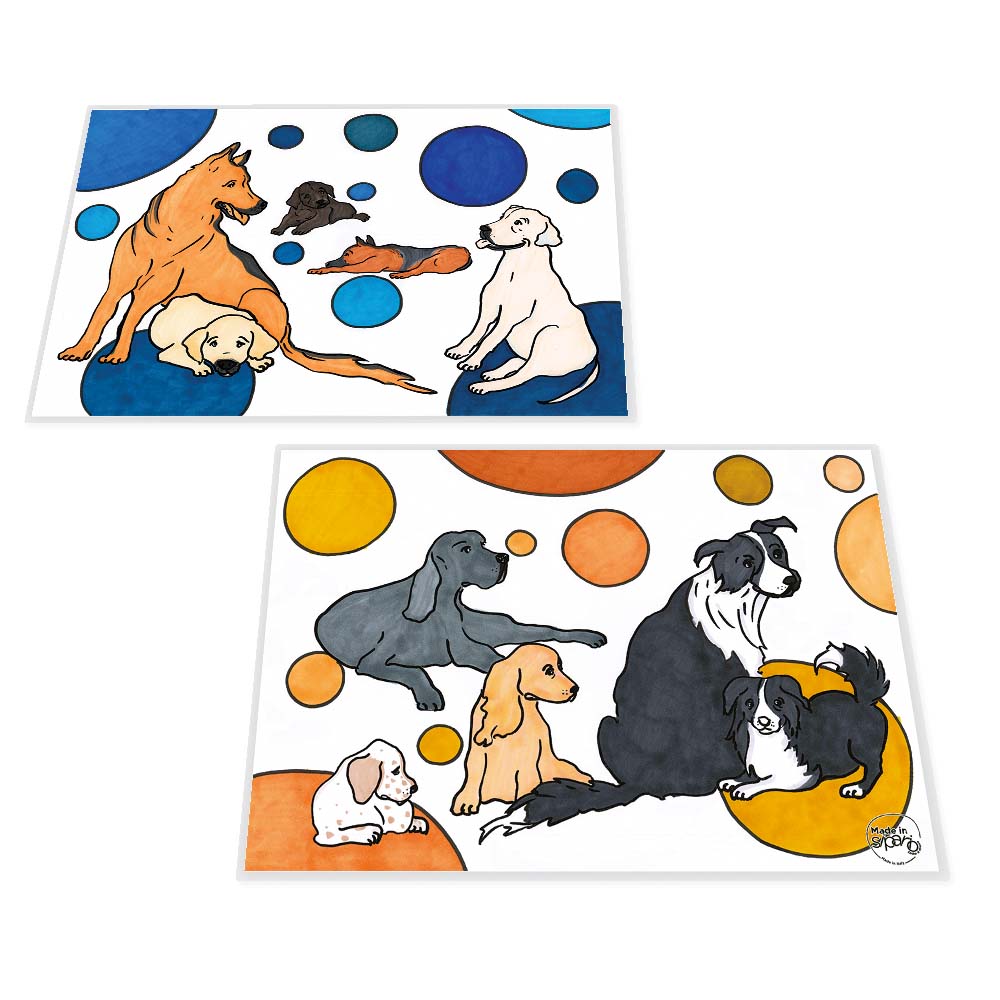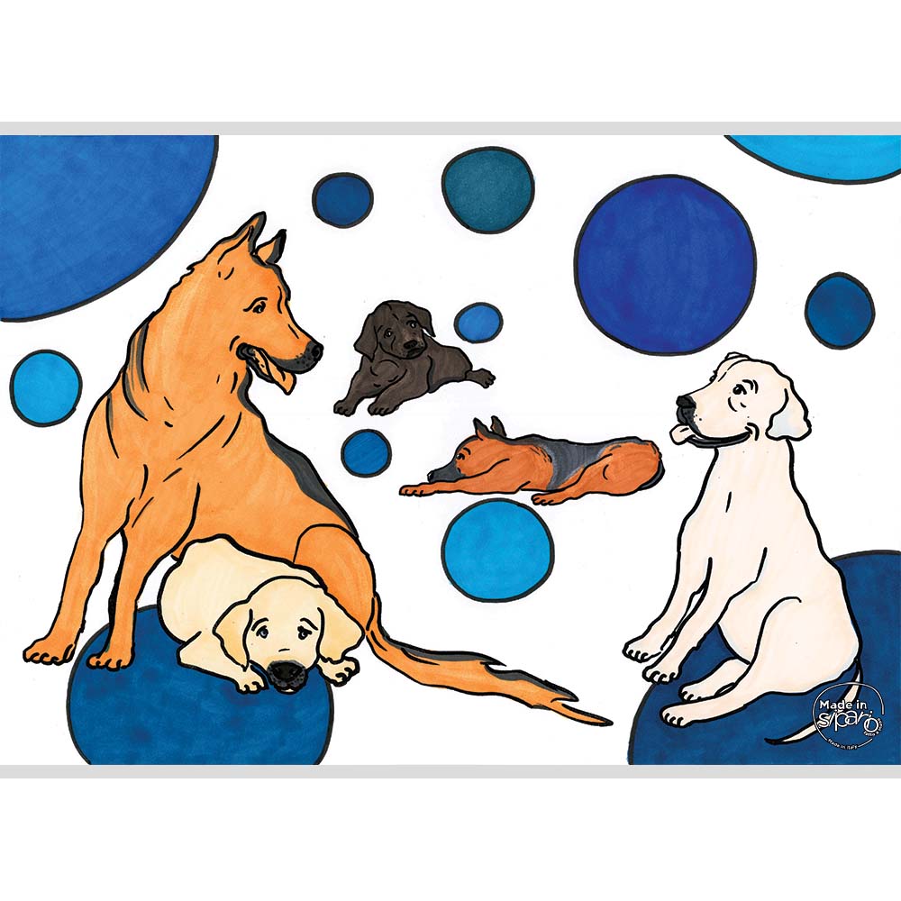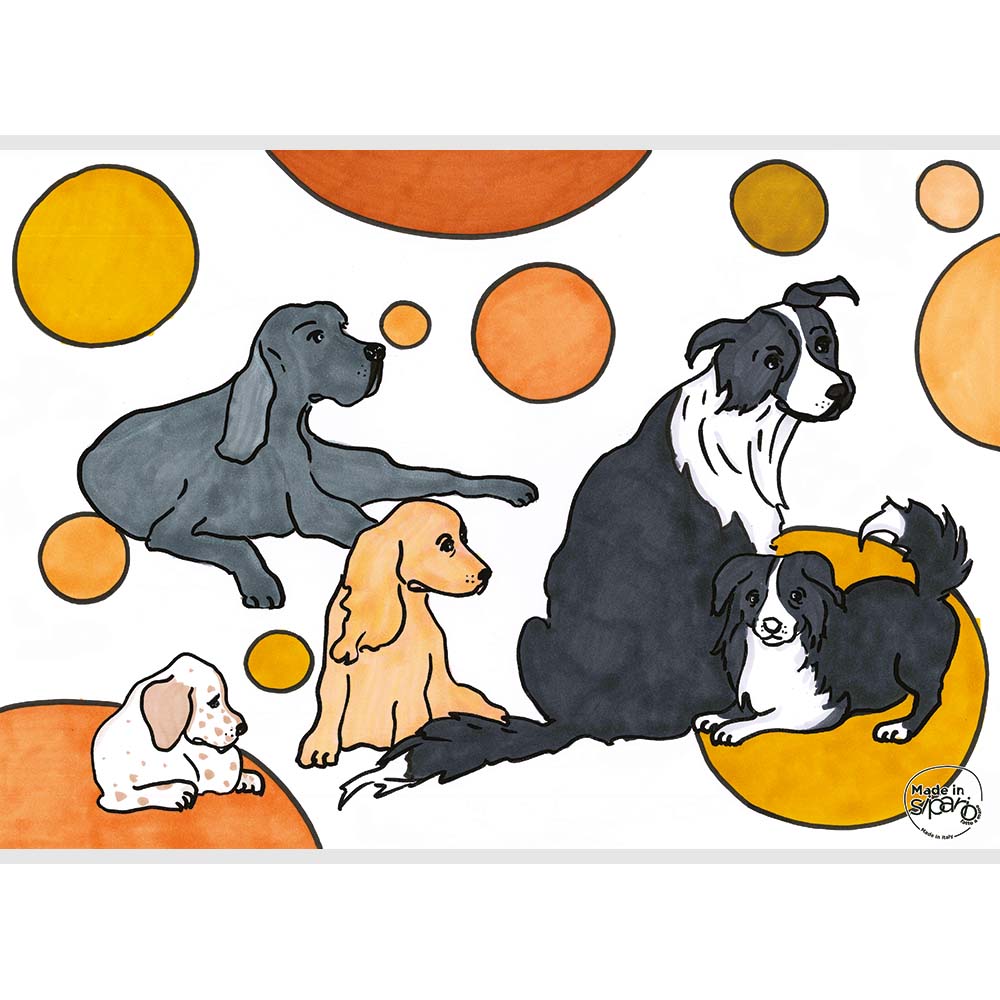 Questa tovaglietta appartiene alla serie “I CANI”, dedicata dagli Artisti Speciali alle varie razze dei loro amati amici. I due lati riportano disegni differenti: da un lato due Border Collie insieme a due Cocker e un Weimaraner (o Bracco di Weimar), dall’altro tre labrador e due pastori tedeschi.