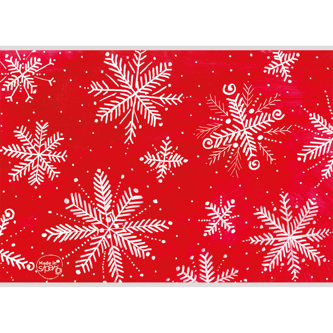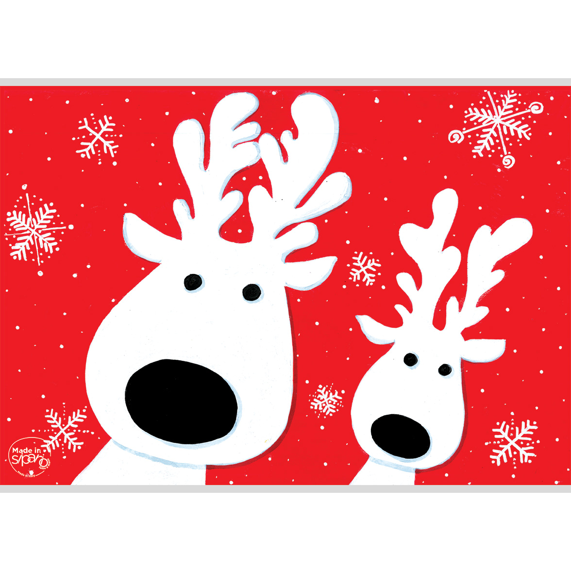 Colore Variante Unica, sempre su fondo rosso, da un lato il disegno di due Renne in colore bianco con il loro bel nasone nero e dall’altro fiocchi di neve.