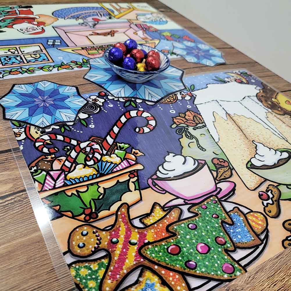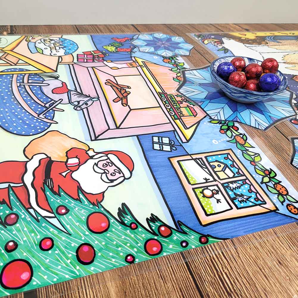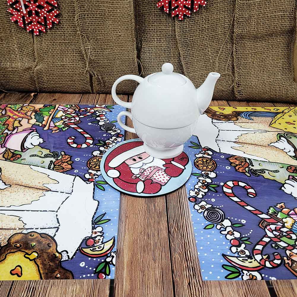 Tovaglietta natalizia raffigurante su un lato Babbo Natale intento a consegnare i doni, dall’altro la tavola piena di dolciumi preparata con amore dai bimbi per accoglierlo.