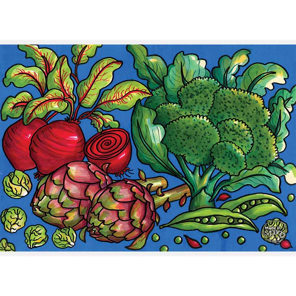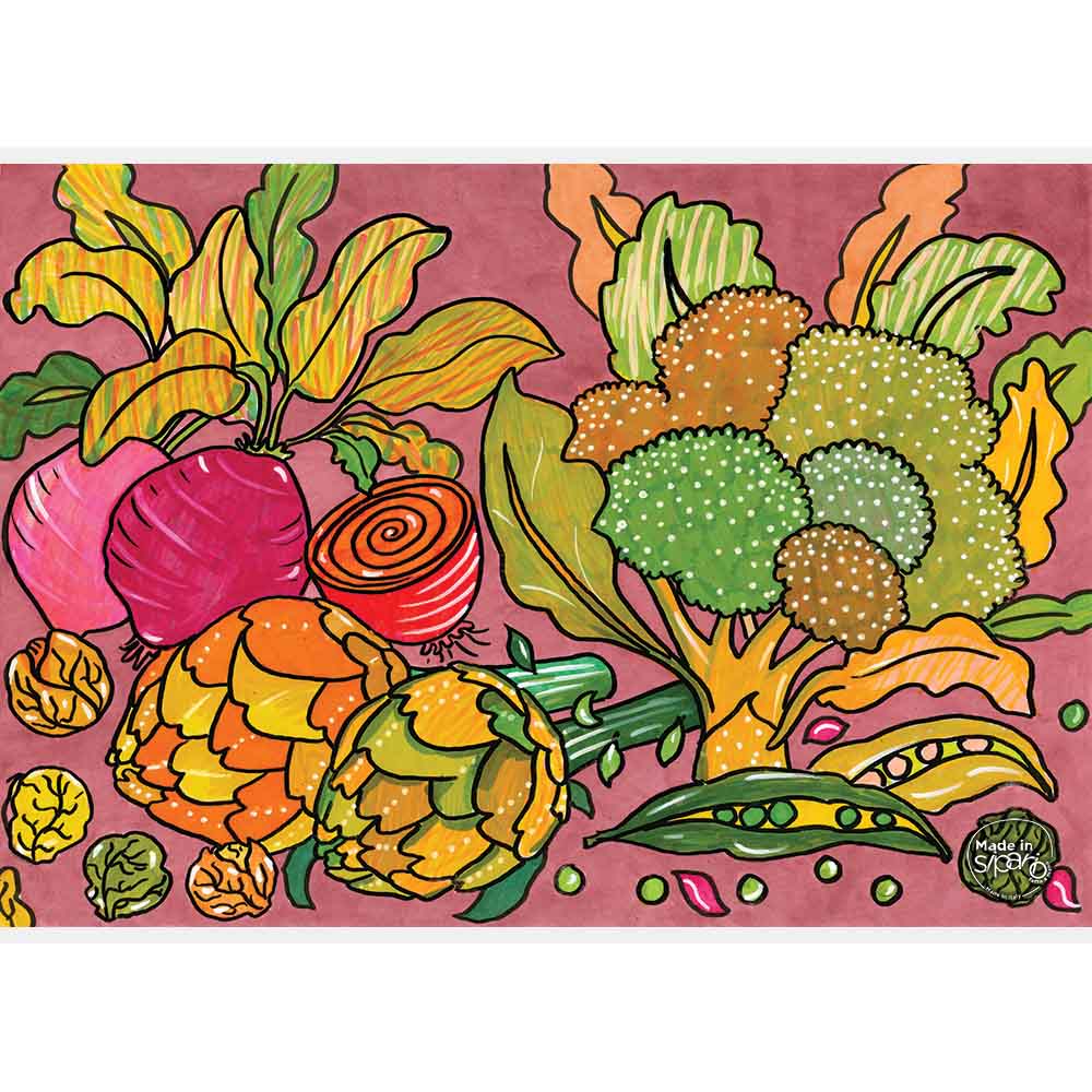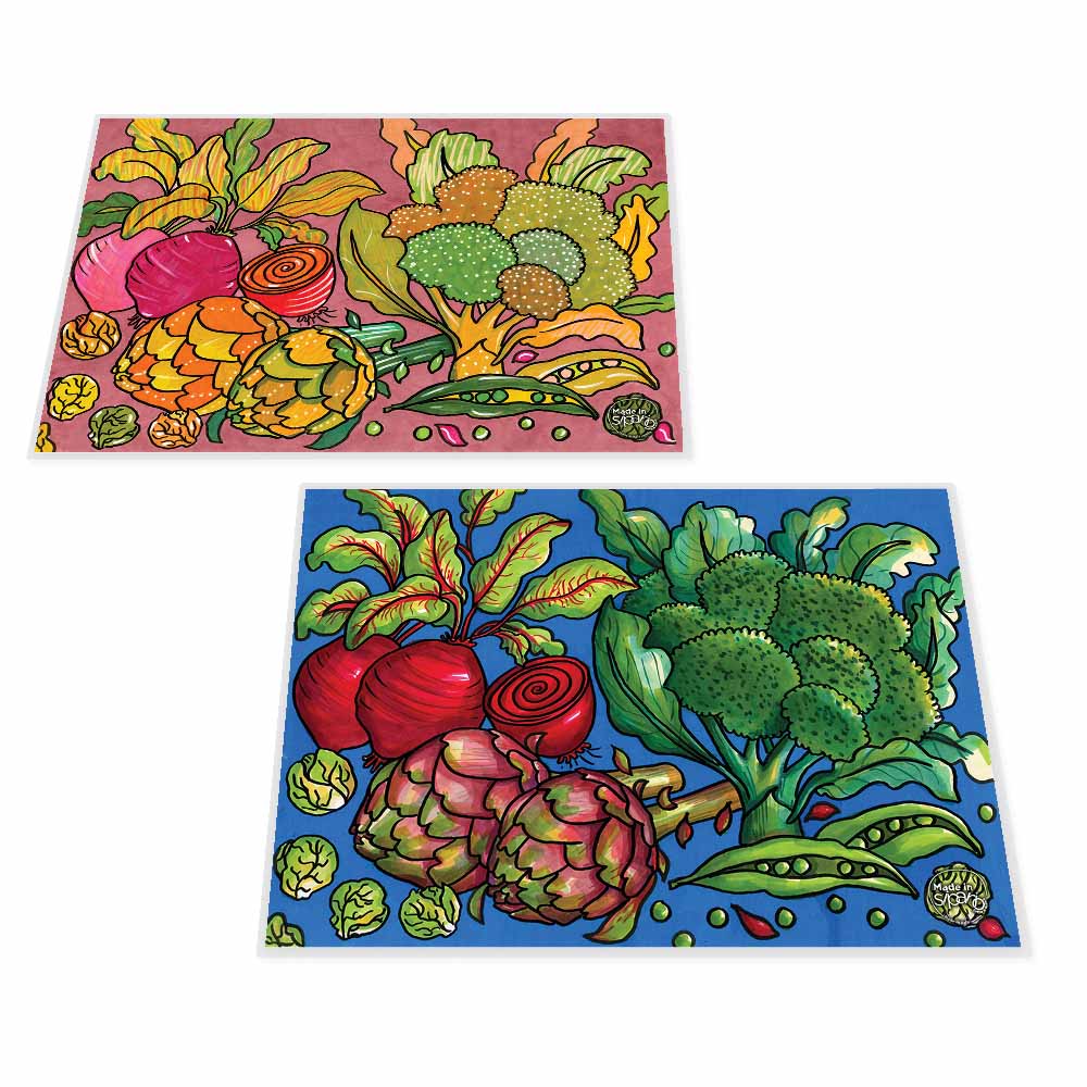 Dovremmo mangiare sempre la verdura di stagione… Cosa si può trovare in inverno? Barbabietole, carciofi, piselli, broccoli… ecco i protagonisti della nostra tovaglietta! Su un lato con colori più tenui, sull’altro con colori accesi e realistici.