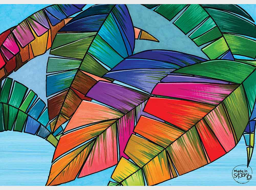 Il fronte rappresenta la coloratissima chioma di una palma sul mare, il retro è un dettaglio delle splendide foglie della pianta.
