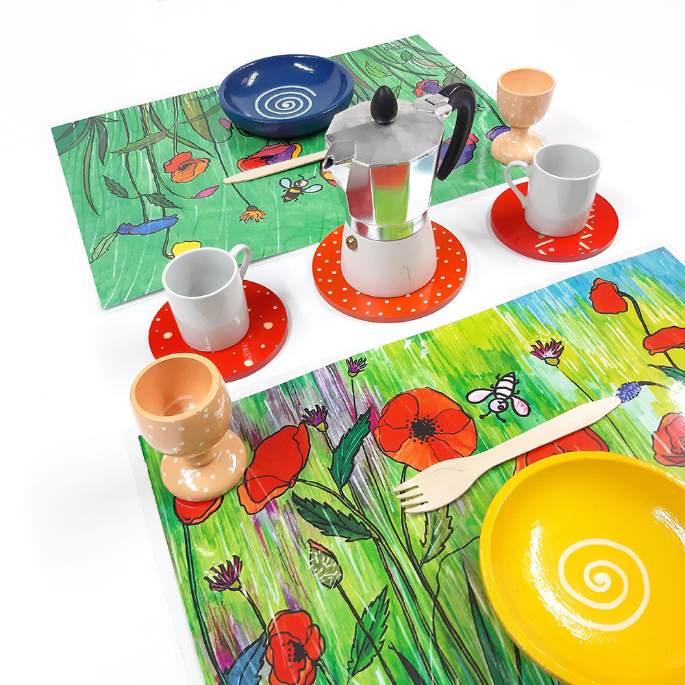 Tovaglietta in cartone, stampata a colori con fantasia originale Made in Sipario, plastificata in modo da renderla lavabile.