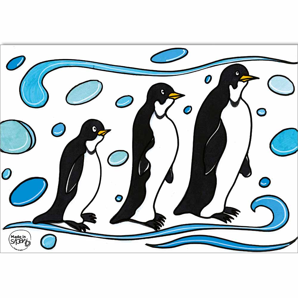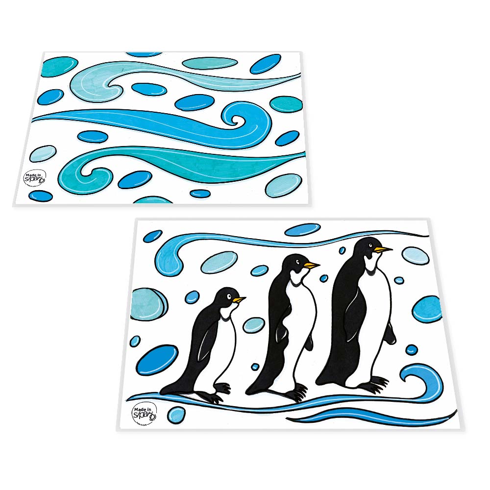 Colore Variante Unica su fondo Bianco, nelle tonalità fredde dei ghiacci del polo sud, dal bianco al celeste, all’azzurro e al blu. I disegni sono differenti su Fronte e Retro, da un lato un gruppo di “PINGUINI” e dall’altro linee sinuose a simulare le onde dell’oceano, abbinabili tra loro.