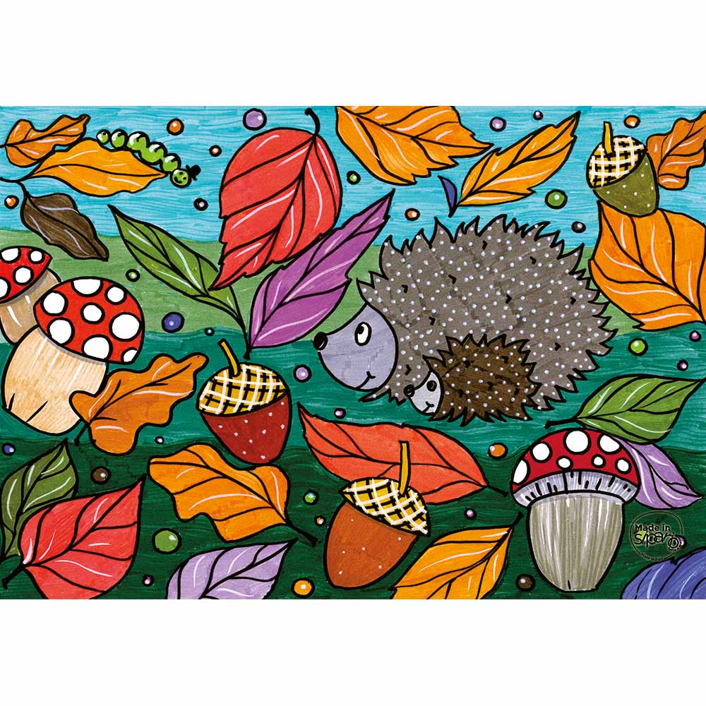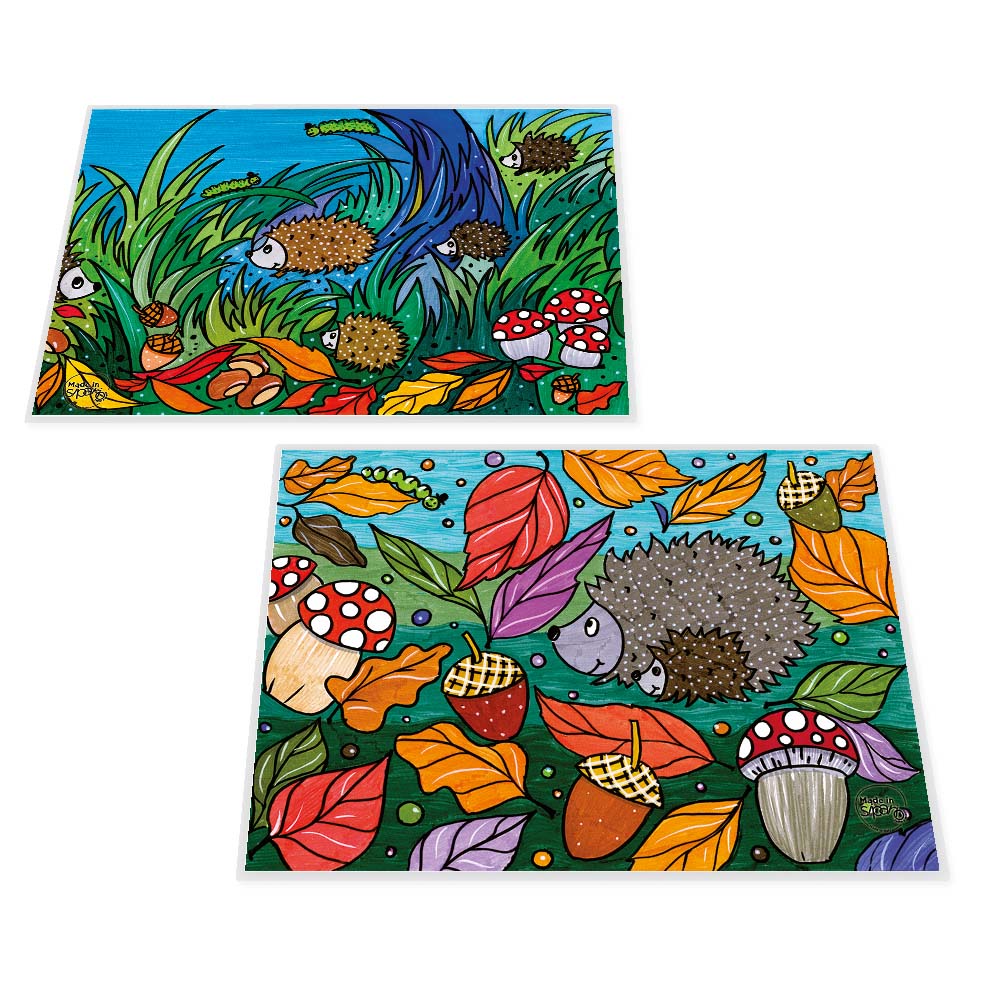Colore Variante Unica sui toni vivaci e caldi del sotto bosco in una bella giornata di autunno: dal verde all’arancio, dal celeste al blu . I disegni sono diversi su Fronte e Retro: da un lato il “Riccio” è in primo piano tra le foglie cadute sul prato e tanti altri particolari tipici autunnali; dall’altro lato tanti piccoli “Ricci” tra l’erba e vicino ad un laghetto.