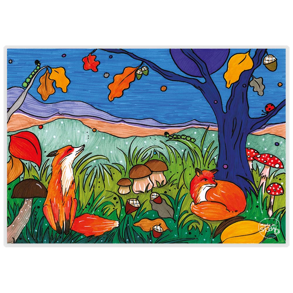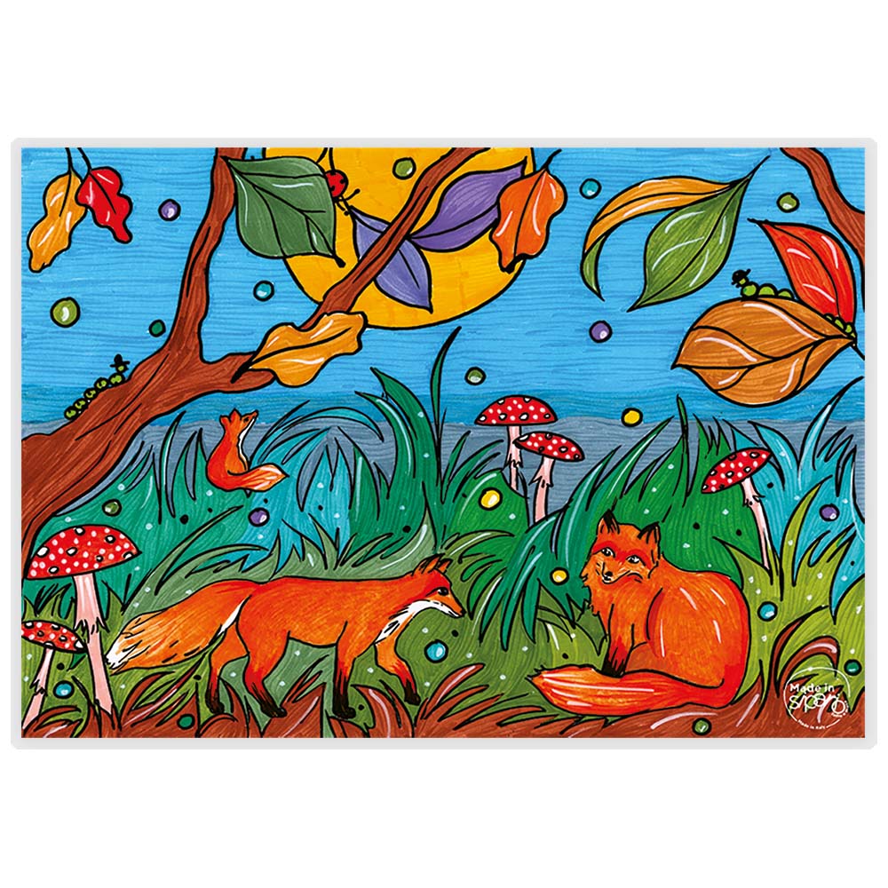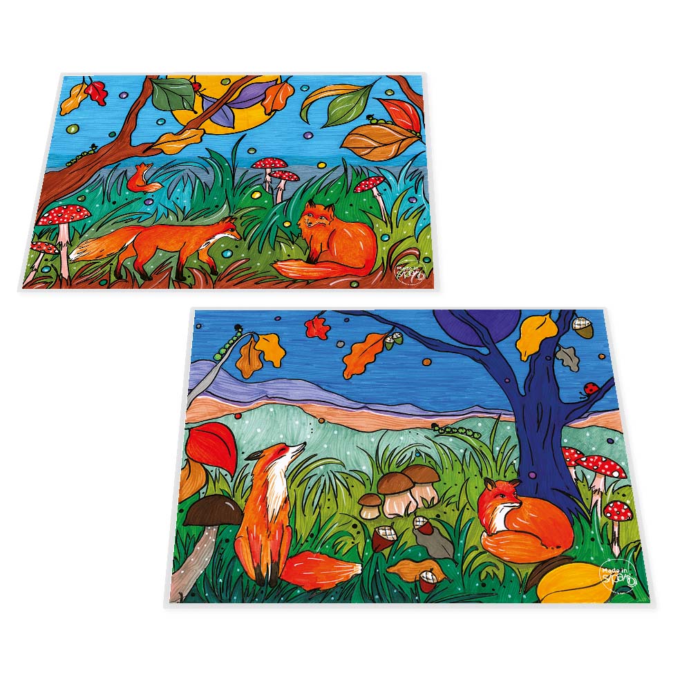 Colore Variante Unica sui toni vivaci e caldi del sotto bosco in una bella giornata di autunno: dal verde all’arancio, dal celeste al blu. I disegni sono diversi su Fronte e Retro… diversi scorci delle nostre piccole volpi nel bosco.