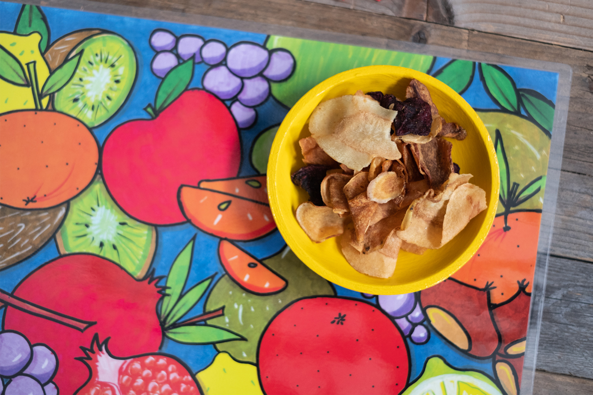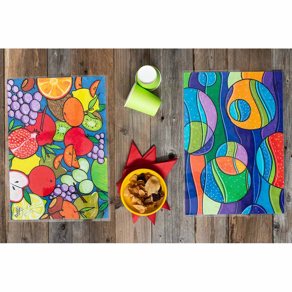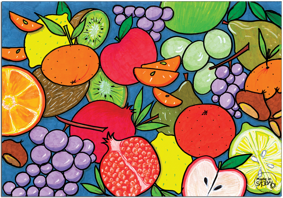 Colore Variante Unica sui toni vivaci della Frutta in Inverno, dall’Arancio al Verde, dal Prugna al Rosso con disegni differenti su Fronte e Retro, da un lato tanta frutta per comporre una “MACEDONIA in INVERNO” e dall’altro un disegno geometrico, abbinabile nei colori con la macedonia.