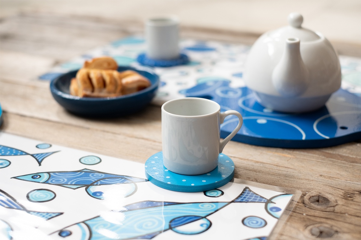 Colore Variante Unica su fondo Bianco, nelle tonalità marine dal celeste, all’azzurro e al blu. I disegni sono differenti su Fronte e Retro, da un lato le “ACCIUGHE” e dall’altro tante bolle d’acqua, abbinabili fra loro.