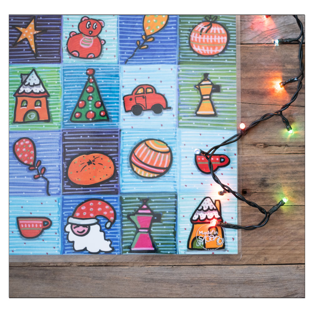 Tovaglietta in cartone, stampata a colori con fantasia originale Made in Sipario, plastificata in modo da renderla lavabile.