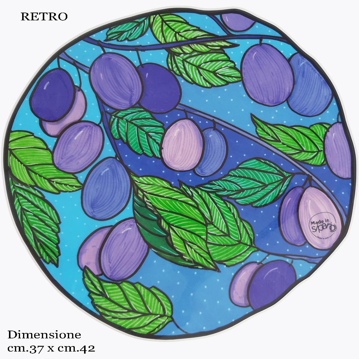 Tovaglietta stampata su Cartone, poi plastificato, con decorazioni diverse fronte / retro: da un lato la SUSINA intera e dall’altro un ramo di albero carico di SUSINE, pronte per essere raccolte