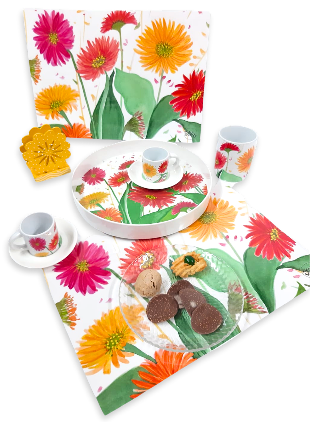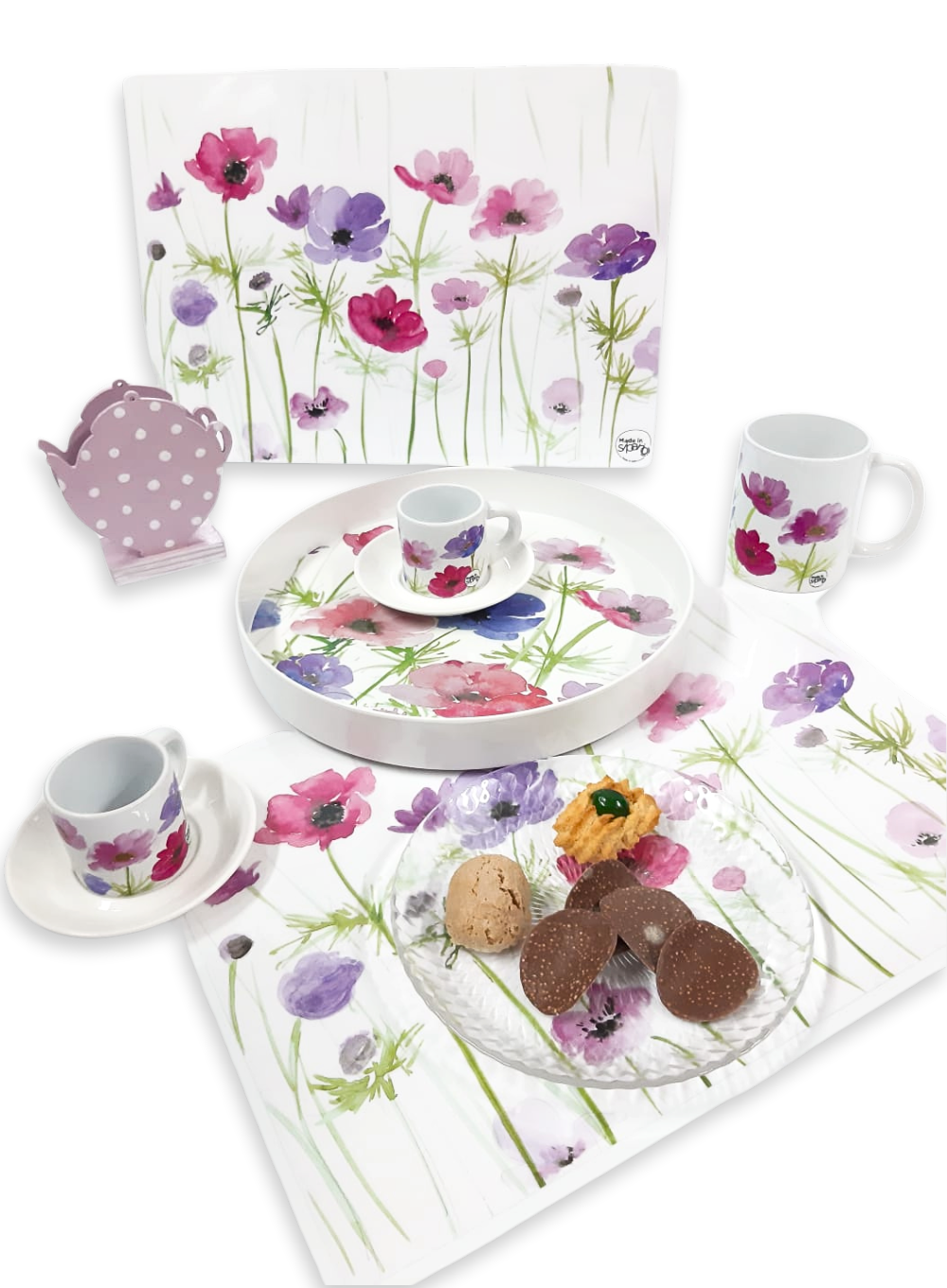 Per la decorazione sono stati scelti 4 dei Fiori della โ€œLinea Botanicaโ€, dipinti con la tecnica dellโ€™Acquerello, e precisamente Gerbere, Tulipani, Rose, Anemoni, Ciliegio, Ibiscus, Peonie, Narcisi e Papaveri.