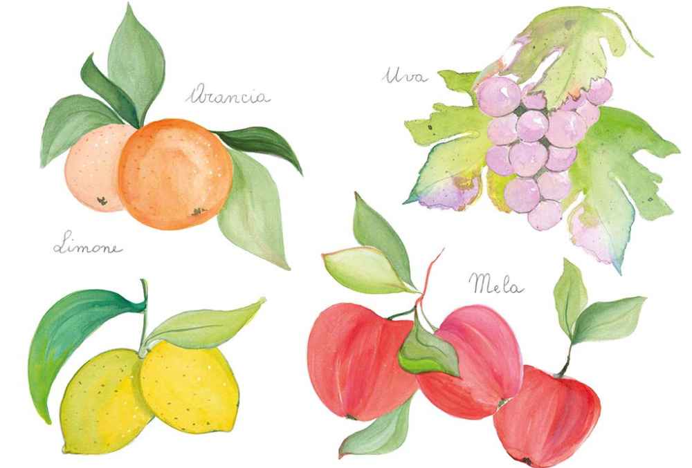 Una linea elegante e delicata con disegni acquerello di mele, uva, limone e arance.